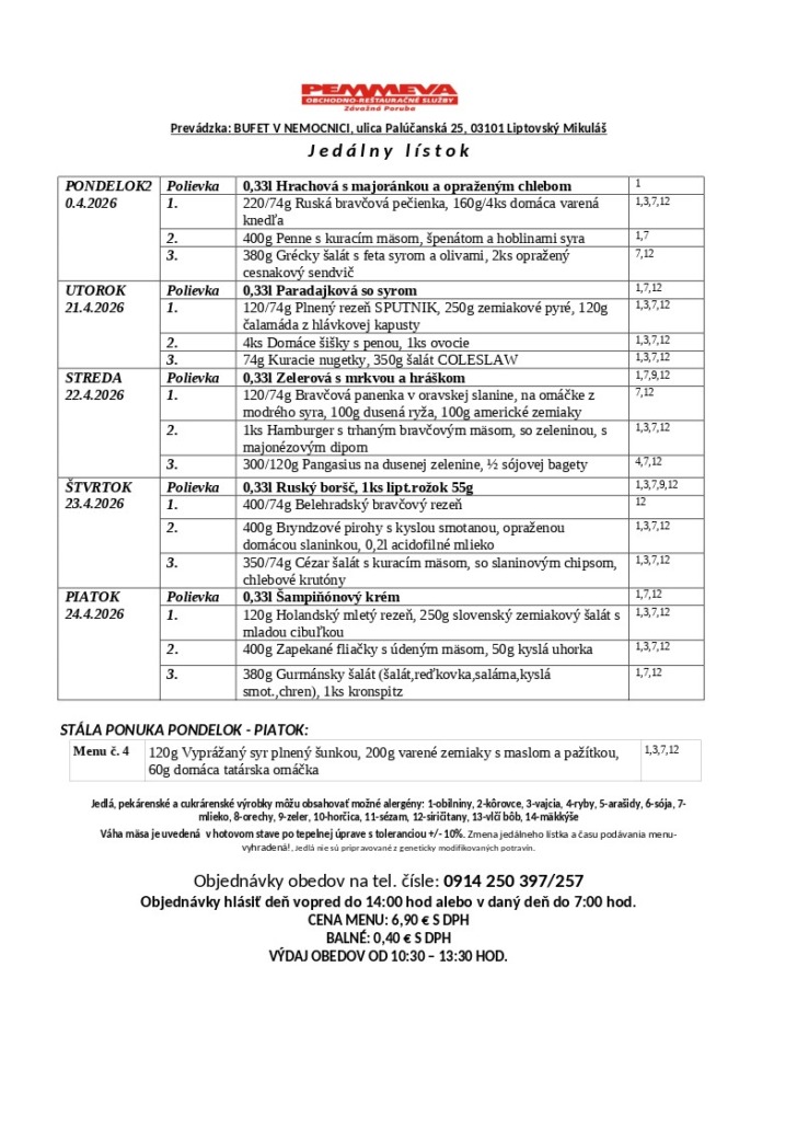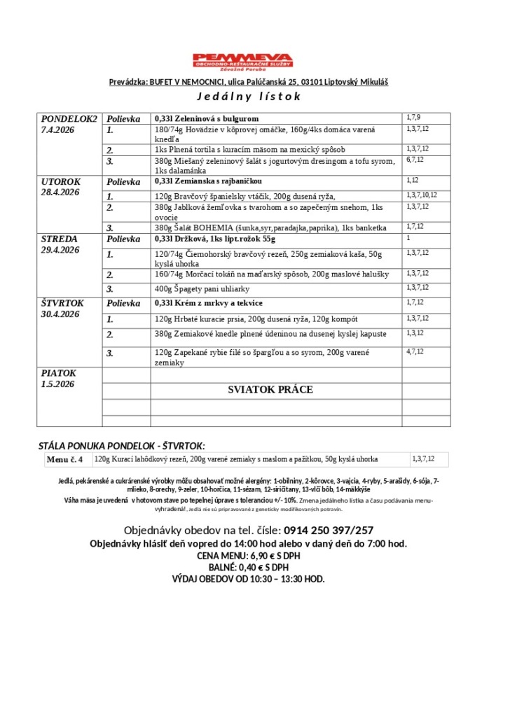 v areáli nemocnice nájdete vo vynovených priestoroch BUFET prevádzkovaný spoločnosťou PEMMEVA, ktorý sa postará o Vaše občerstvenie počas čakania na vyšetrenie alebo hospitalizácie.